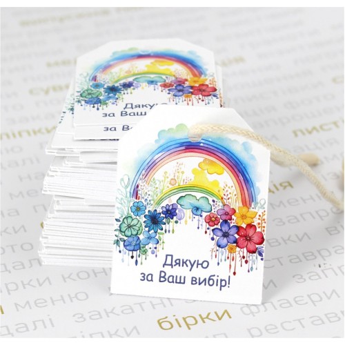 Яркие бирки для Вашей упаковки. Добавьте бирку в пакет с товаром, чтобы выразить благодарность вашим клиентам за их выбор. Такие бирки подчеркивают вашу благодарность и заботу о клиентах, делая каждый заказ особым. Может быть двусторонняя. На обратной стороне бирка может носить информативный характер, например состав или меры ухода. вес и т.д. По желанию можно заказать индивидуальную бирку, добавив любую Вашу информацию или логотип. Изменение/добавление любой текстовой информации - услуга платная. Бирка может быть любого размера (по запросу). Количестов/стоимость. Бирку можно использовать для разных товаров: одежда, обувь, игрушки, посуда и т.д. Стандартная бирка печатается на плотной мелованной матовой бумаге 300-350г/м2.