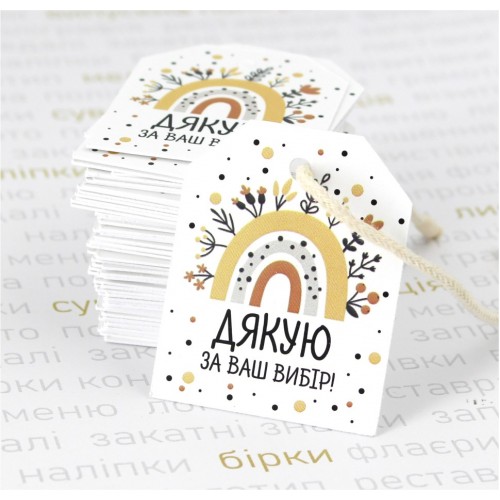 Бирки для любой Вашей продукции с надписью "Дякую за Ваш вибір". Такие бирки подчеркивают вашу благодарность и заботу о клиентах, делая каждый заказ особенным. Может быть двусторонняя. На обратной стороне бирка может носить информативный характер, например состав или меры ухода. вес и т.д. По желанию можно заказать индивидуальную бирку, добавив любую Вашу информацию или логотип. Изменение/добавление любой текстовой информации - услуга платная. Бирка может быть любого размера (по запросу). Количестов/стоимость. Бирку можно использовать для разных товаров: одежда, обувь, игрушки, посуда и т.д. Стандартная бирка печатается на плотной мелованной матовой бумаге 300-350г/м2.