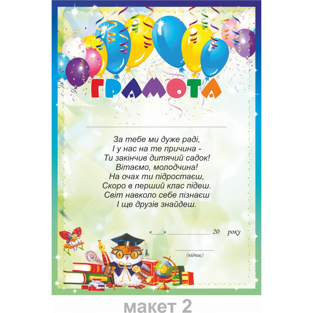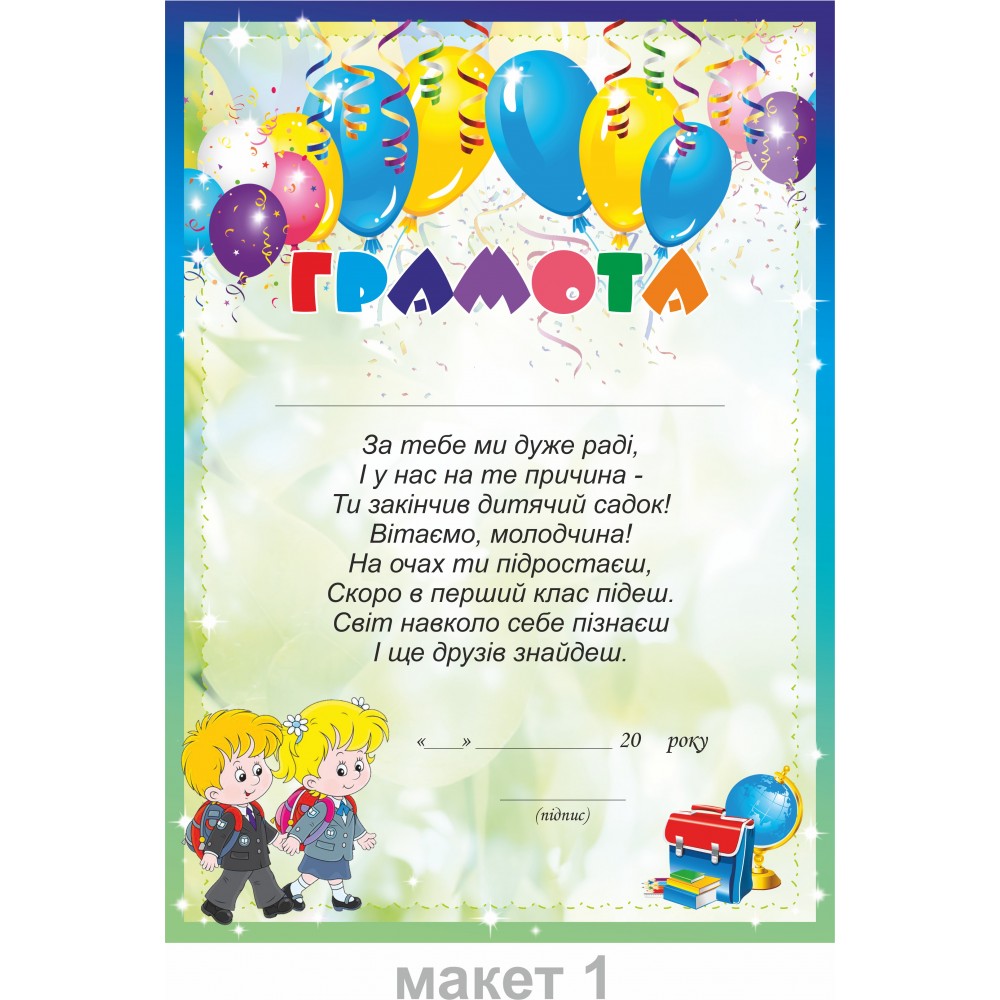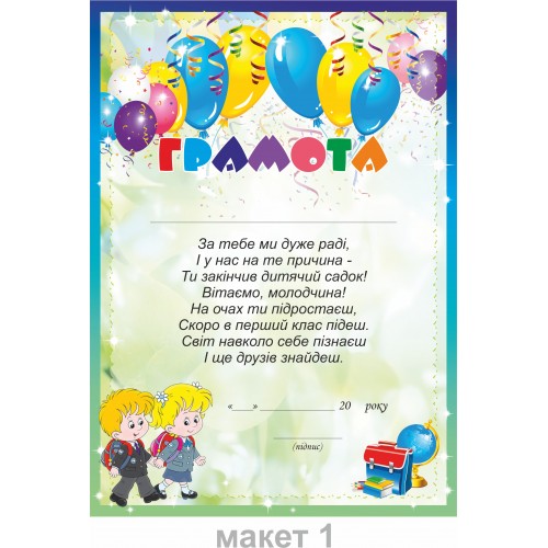 Для Вашего маленького выпускника предлагаем грамоту с изображением желто-голубых шариков. Грамота напечатана на плотной бумаге 300-350г/м2. Для заказа доступный готовый для заполнения бланк, который Вы сможете заполнить самостоятельно или заказать именную грамоту, где можно вставить название заведения, дату, имя и фамилию ребенка. Изготовление грамоты может занять 3-5 рабочих дней (сроки зависят от тиража и загруженности (апрель/май загруженность 101%)).