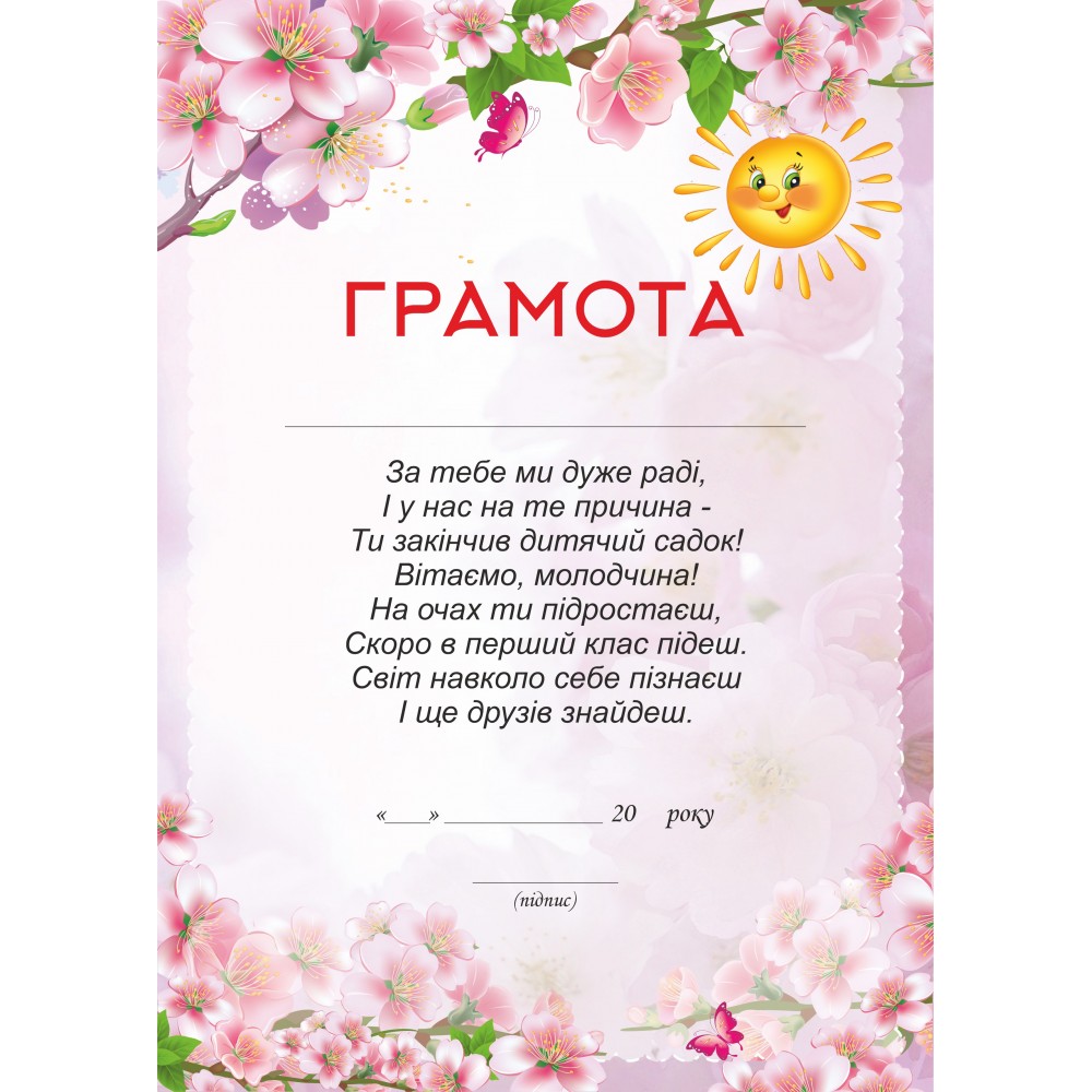 Грамота выпускнику – это не просто документ, а теплое воспоминание о важном жизненном этапе. Идеальный сувенир, который сохранит воспоминания радости в этот особенный день! Яркий дизайн, торжественный текст и качественная печать делают ее отличным подарком для выпускников сада. Грамота напечатана на плотной бумаге 300-350г/м2. Вы также можете заказать именную грамоту, в которой можно вставить название заведения, дату, имя и фамилию ребенка. Изготовление грамоты может занять 3-5 рабочих дней (сроки зависят от тиража и загруженности (апрель/май загруженность 101%)).