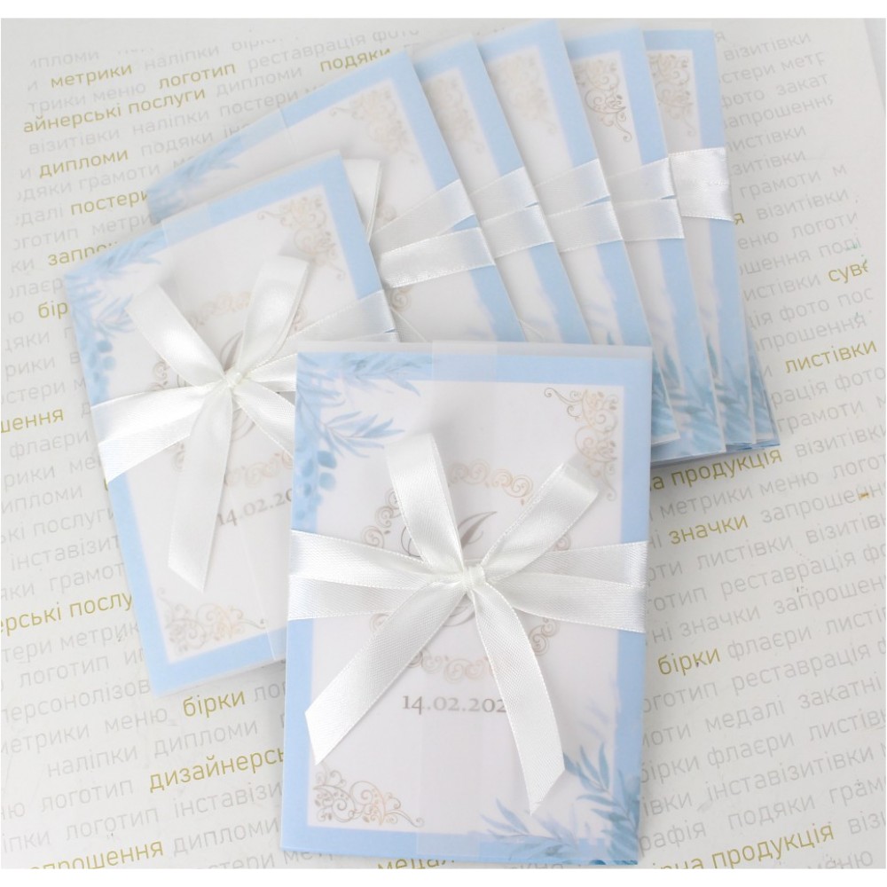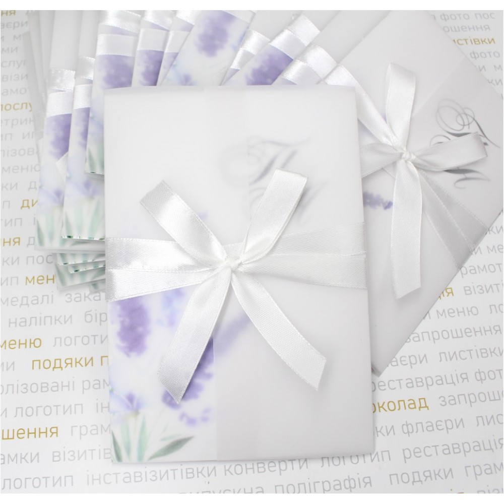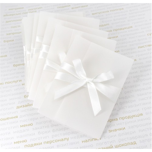 Если Вы хотите положить пригласительный не в конверт, предлагаем перламутровую кальку марки Pergamenata (perl, perl ice, silver) или калька GSK плотностью 90-100/м2. Укомплектовать можно лентой (цвет айвори) или сердечком (золото, серебро) на выбор. Дополнительно на ленту можно прицепить бирку под дизайн самого приглашения. Размер кальки 148-150х223-250мм. Калька в сложенном виде имеет размер 105х148-150мм.
