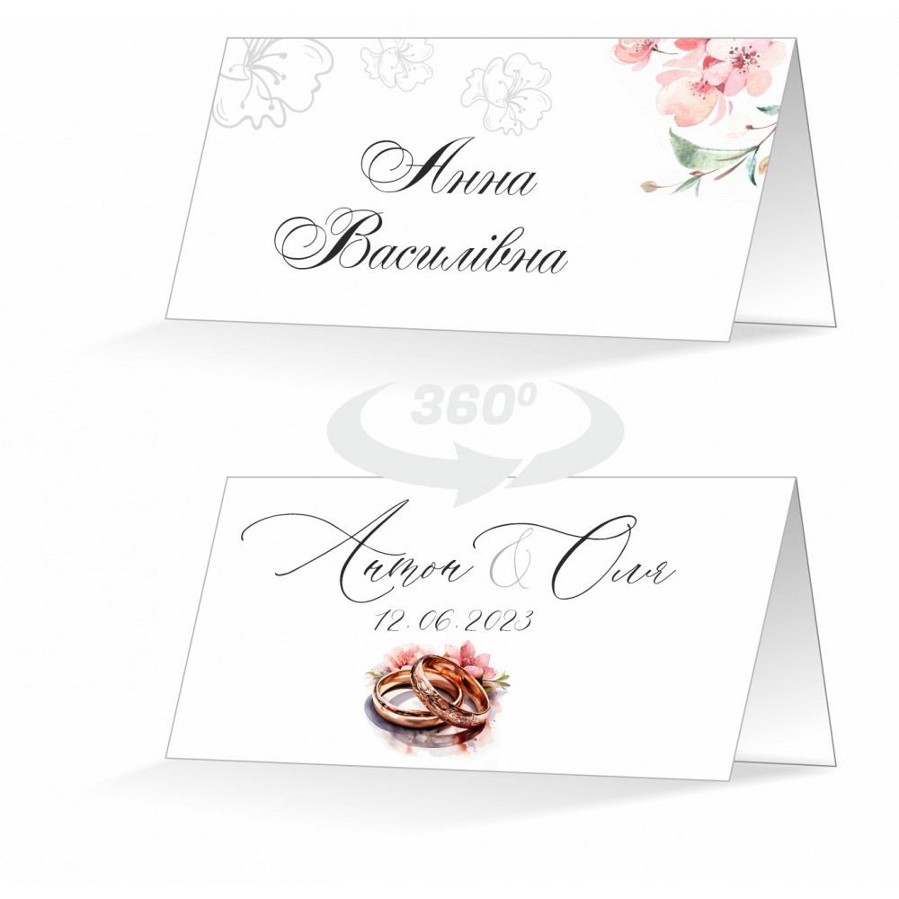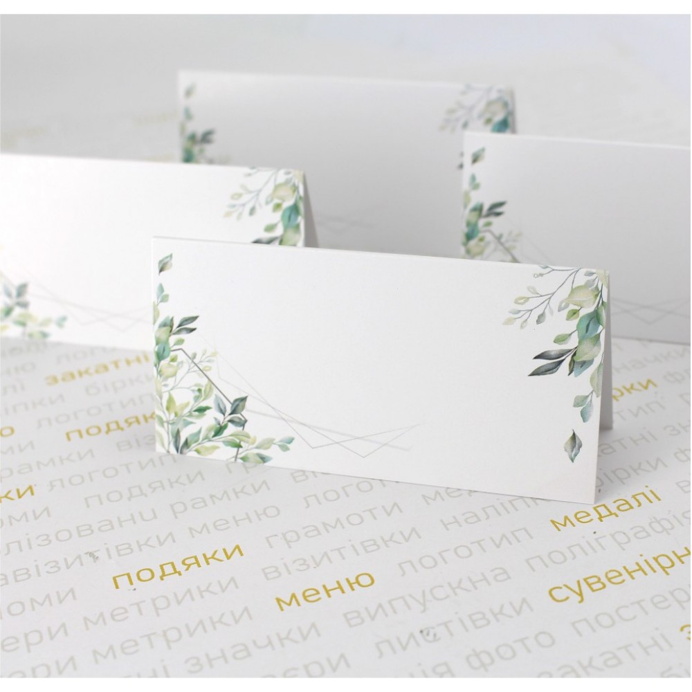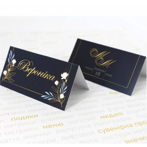 Карточки на стол с именами гостей. Если Вы уже знаете количество и имена гостей, можно уже с именами напечатать (именной дизайн), но если есть нюансы, например Вы не знаете количество и кто именно будет, можно заказать карточки с дизайном, но без имени, куда можно будет вписать имена от руки. Карточки имеют размер 10х9,5см в развернутом виде, 9,5х5см в сложенном виде. Могут быть любого размера по запросу. Также это может быть любой дизайн из нашего сайта. Печатаются карточки на плотной мелованной матовой бумаге 300-350г/м2.
