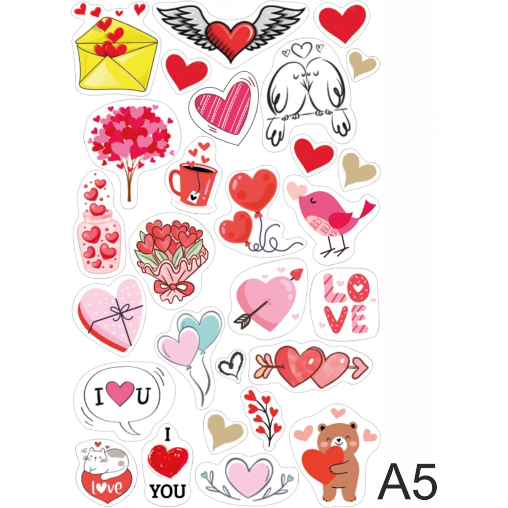 Ко Дню влюбленных предлагаем тематический стикерпак с разными наклейками. В наборе 28 наклеек (А4) м 15 наклеек (А5) . Есть возможность выбрать А5 или А6 формат. Печатается на качественной бумаге Raflatac или пленке Ritrama с высококачественной и четкой цветопередачей и всех деталей изображения. Можно использовать для наклейки на разных поверхностях: стекло, пластик, дерево, бумагу, металл.
