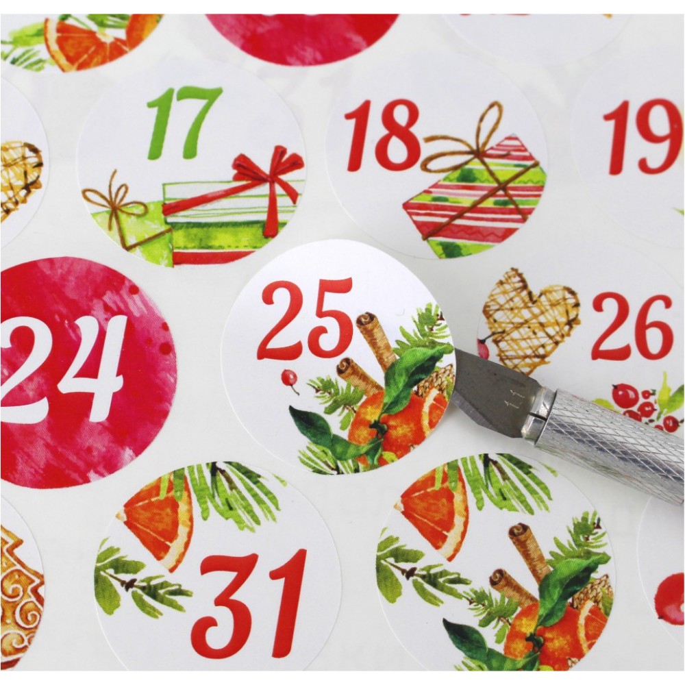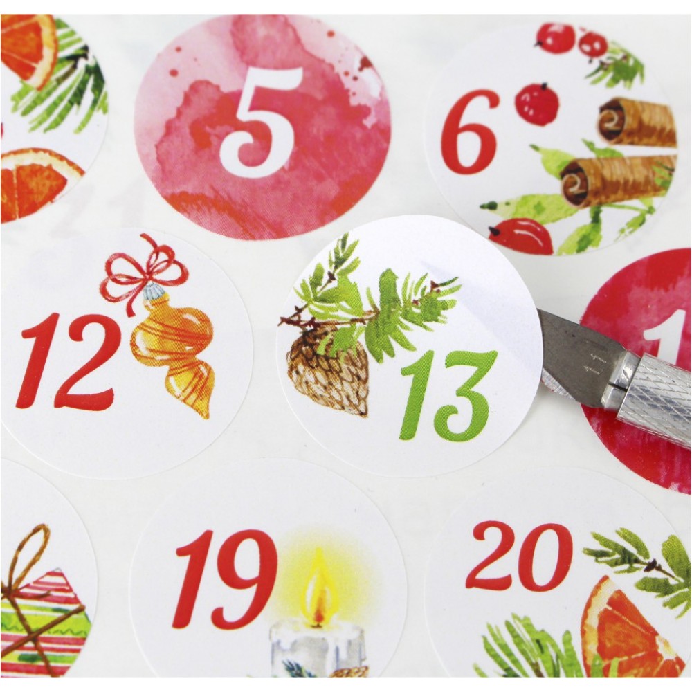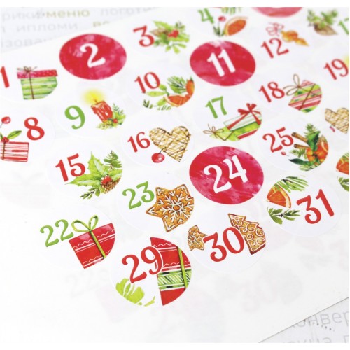 Наклейки для адвент-календаря – праздничный набор, который поможет создать волшебную предновогоднюю атмосферу. В комплекте – тематические наклейки с номерами дней и зимними иллюстрациями. Идеально подходят для украшения коробочек, конвертов или подарков в вашем адвент-календаре. Самоклеющиеся, яркие, легко наносятся на любую поверхность. Прекрасный способ добавить праздничности ожиданию Рождества иили Нового года. Форма-круг 30мм. Печатается на качественной бумаге Raflatac или пленке Ritrama с высококачественной и четкой цветопередачей и всех деталей изображения. Можно использовать для наклейки на разных поверхностях: стекло, пластик, дерево, бумага, металл.