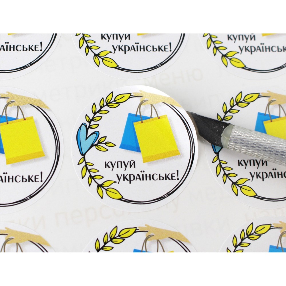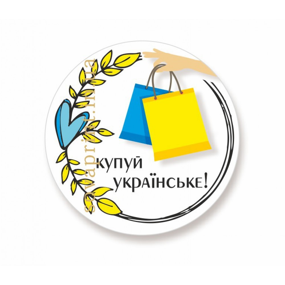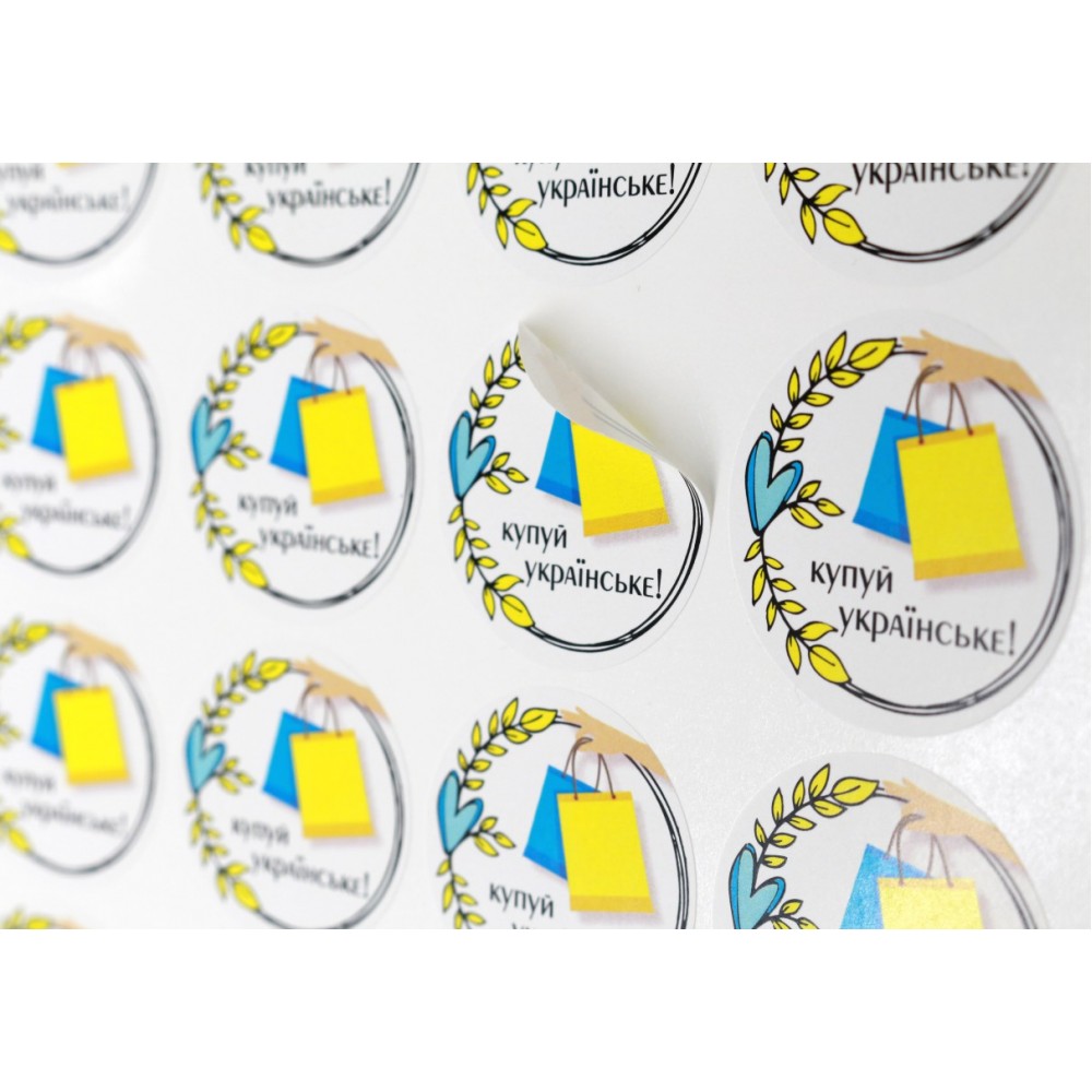 Україна понад усе! Если Вы являетесь национальным производителем и хотите промаркировать свой товар, акцентировав внимание покупателя на украинском производстве, предлагаем это сделать с помощью наклейки с надписью "Покупай украинское". Добавьте Вашей упаковке и товару визуально большую привлекательность и завершенность с помощью наклейки. Наклейка может быть любого размера (размер/количество в таблице ниже). Печатается на листах формата А3 на качественной бумаге Raflatac с высококачественной и четкой цветопередачей и всех деталей изображения. Можно использовать для наклейки на разных поверхностях: стекло, пластик, дерево, бумага, металл.