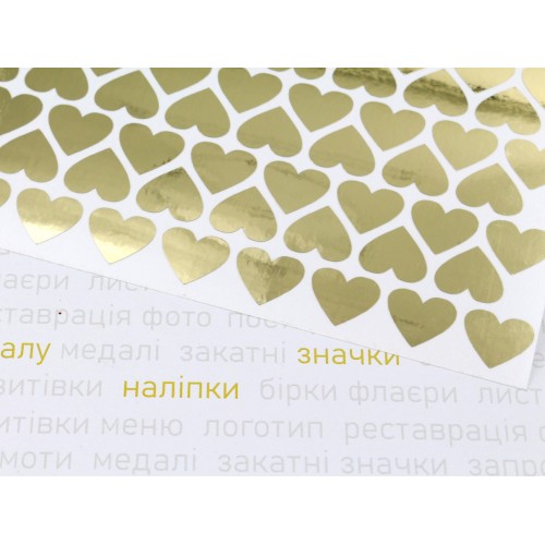 Предлагаем наклейки фигурные сердце золото. Имеется два размера 18х15мм и 30х25мм на выбор. В наборе 110шт. Наклейки на основе металлизированной пленки. Подойдут для наклейки на любую чистую гладкую поверхность: стекло, пластик, дерево, бумага, металл. Может быть любого размера и формы по запросу. Можна заказать 50 или 30шт