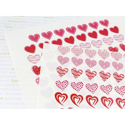 Имеем наклейки в виде сердечек. Размер всех сердечек по большей стороне 30мм. В наборе 15 видов сердечек, всего 118шт. Подойдут для наклейки на любую чистую гладкую поверхность: стекло, пластик, дерево, бумага, металл. Может быть любого размера и формы по запросу.