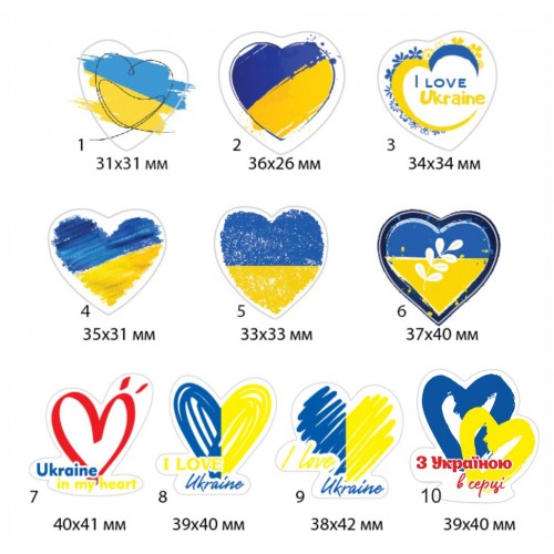 У нас Вы можете выбрать паториотические наклейки в форме сердца разного размера. Можно выбрать один или несколько на одном листе. Печатается на листах формата А3 на качественной бумаге Raflatac с высококачественной и четкой цветопередачей и всех деталей изображения. Можно использовать для наклейки на разных поверхностях: стекло, пластик, дерево, бумагу, металл.