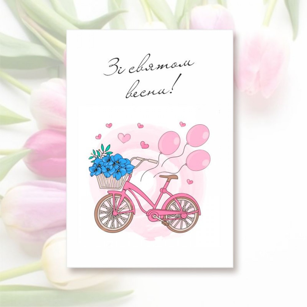 Открытка с поздравлением наступления весны. Подойдет для праздника 8 марта, Дня Матери. Также такая открытка может быть отличным комплиментом для клиентов от продавца или производителя. Напечатаны на плотной мелованной бумаге. На открытку можно добавить любой текст (услуга платная). Это изображение можно использовать на бирках или наклейках.