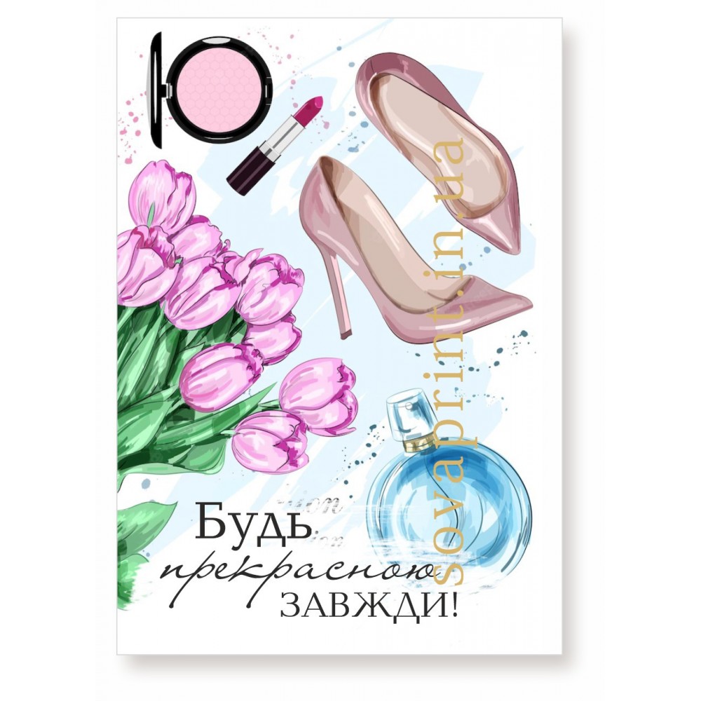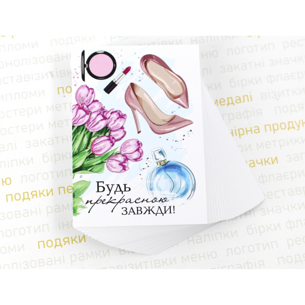 Свежий, яркий дизайн открытки с надписью "Будь прекрасною завжди". Подойдет для любого случая сказать женщине приятные слова: 8 марта, Дня Матери или ко Дню рождения, или просто так. Такая открытка может быть прекрасным комплиментом в заказе от продавца. Напечатаны на плотной мелованной бумаге. На открытку можно добавить любой текст (услуга платаня). Это изображение можно использовать на бирках или наклейках.