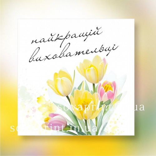 Независимо от того, ищете ли вы открытку для особого события, такого как свадьба, день рождения, или просто выражение своей любви и поддержки, или благодарности и симпатии - у нас есть что-то для каждого случая и настроения. Вот такая яркая солнечная открытка для воспитательницы, лучшей воспитательницы! Подойдет к любому основному подарку. Открытка 7х10 см. Напечатаны на плотной мелованной бумаге. На открытку можно добавить любой текст (платная услуга). Это изображение можно использовать на бирках или наклейках.
