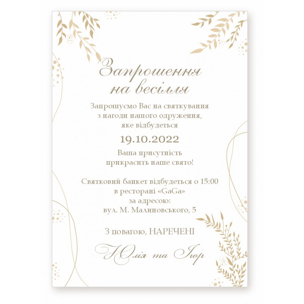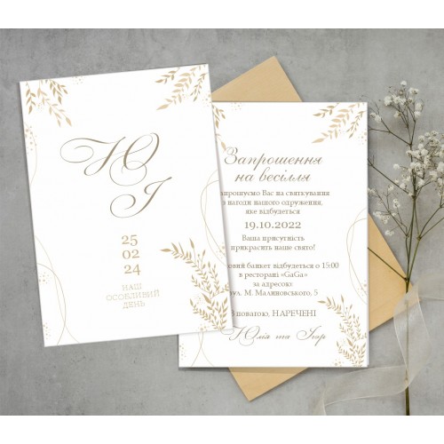 На Ваш праздник есть Свадебные Пригласительные для гостей. Есть возможность заказать именные или бланк для самостоятельного заполнения. В именном пригласительном вся информация изменяема (двустороннее приглашение). Бланк пригласительного (одностороннее). Размер пригласительного 148х105мм(А6). Пригласительный можно положить в конверт. Также можно заказать бирки в стиле пригласительных. Печатается на плотной бумаге 350г/м2. Также доступен цифровой вариант пригласительных, Вы можете разослать неограниченному количеству гостей удобным для Вас способом – по e-mail, вайбер, телеграмм и т.д.