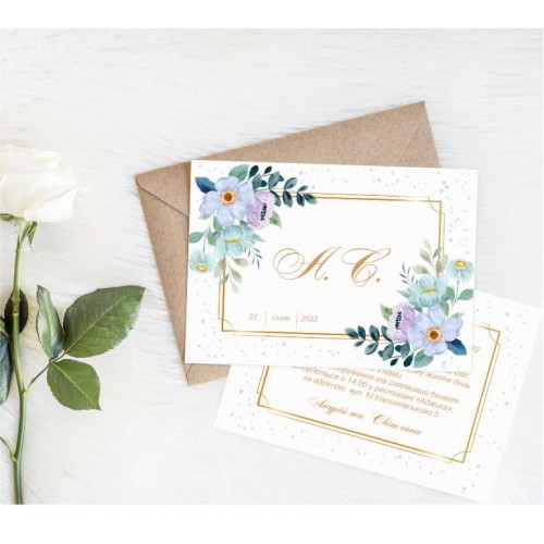Предлагаем Вам пригласительный на свадьбу А6 формата (105х148мм). Можно заказать как именной дизайн, где Вы можете добавить инициалы жениха и невесты, время, адрес, название ресторана и т.д. (двусторонний пригласительный), также и стандартный бланк для самостоятельного заполнения (двусторонний пригласительный). Дополнительно можете заказать конверт. Также доступный цифровой вариант пригласительного, который Вы можете разослать неограниченному количеству гостей удобным для Вас способом – по e-mail, вайбер, телеграмм и т.д. Стоимость цифрового пригласительного – 80 грн. Дополнить пригласительные можно свадебными бирками, которые долго будут напоминать гостям о Вашем празднике.