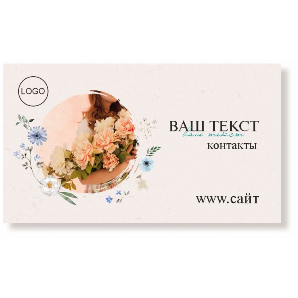 У нас Вы можете заказать визитки 50х90 мм готового решения в цветочной тематике, выбрав такой вариант, Вы подставляете только свой текст. Мы подберем для Вас самый лучший шрифт (шрифтовое решение отсылается на согласование в 3-5 вариантах). Визитная карточка печатается на плотной бумаге 300-350 г/м2 (максимально возможная плотность 400 г/м2). Могут быть одно- и двусторонние, с ламинацией мат, глянец или Soft Touch.
