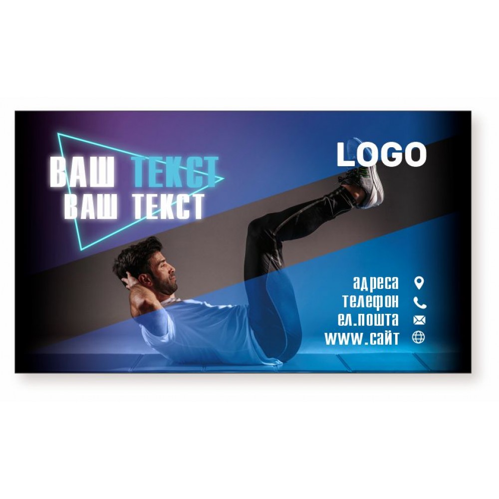 Выбрав любой дизайн с темой спорта есть возможность заламинировать пленкой мат, глянец или Soft Touch*. В визитку с готовым решением мы вставим любой текст. Подберем для Вас самый лучший шрифт (шрифтовое решение отсылается на согласование в 3-5 вариантах). Визитка печатается на плотной бумаге 300-350 г/м2 (максимально возможна плотность 400 г/м2).