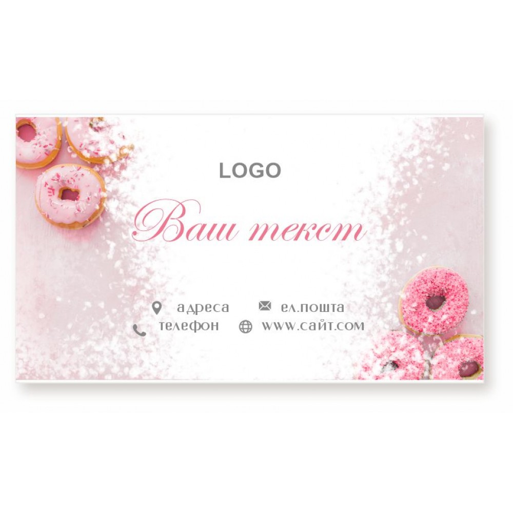Для вашего сладкого бизнеса предлагаем визитки с готовым дизайном. Достаточно отправить нам свой текст и мы пришлем Вам макет визитки на согласование. Наши дизайнеры подберут для Вас самый лучший шрифт (шрифтовое решение отсылается на согласование в 3-5 вариантах по запросу). Визитка печатается на плотной бумаге 300-350 г/м2 (максимально возможна плотность 400 гр/м2). Могут быть одно- и двусторонние, с ламинацией мат, глянец или Soft Touch*.
