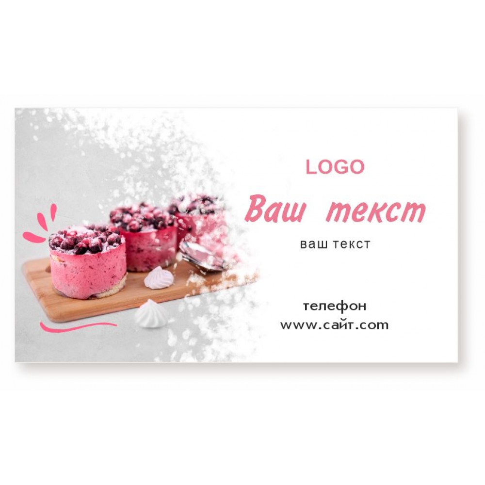 Если вы ищете визитки с готовым дизайном, они у нас есть! Предлагаем дизайн в теме выпечка, кулинария, кондитер. Вы присылаете нам свой текст, мы вставляем и отсылаем Вам макет визитки на согласование. Наши дизайнеры подберут для Вас самый лучший шрифт (шрифтовое решение отсылается на согласование в 3-5 вариантах по запросу). Визитка печатается на плотной бумаге 300-350 г/м2 (максимально возможна плотность 400 гр/м2). Могут быть одно- и двусторонние, с ламинацией мат, глянец или Soft Touch*.
