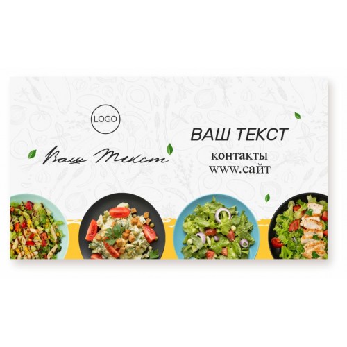 К Ваши услугам готовый вариант визитки в тематике еда, куда Вы вставляете свой текст. Такое решение визитки является бюджетным вариантом в отличии от более дорогих дизайнерских визиток. Мы подберем для Вас самый лучший шрифт (шрифтовое решение отсылается на согласование в 3-5 вариантах). Визитная карточка печатается на плотной бумаге 300-350 г/м2 (максимально возможная плотность 400 г/м2). Могут быть одно- и двусторонние, с ламинацией мат, глянец или Soft Touch*.