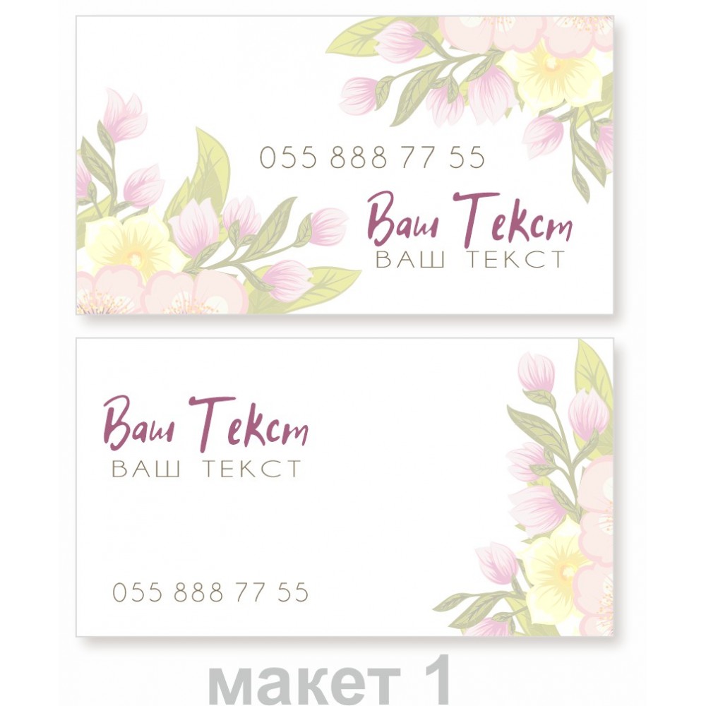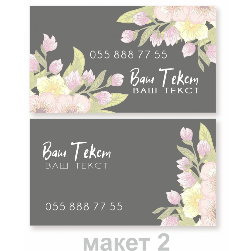 Предлагаем печать двухсторонней визитки в цветочной теме. Подойдет для многих сфер деятельности. В нашем интернет магазине Вы можете заказать визитки, выбрав дизайн из уже готовых наших шаблонов, вставив свой текст. Такое решение визитки является бюджетным вариантом в отличии от более дорогих дизайнерских визиток. Мы подберем для Вас самый лучший шрифт (шрифтовое решение отсылается на согласование в 3-5 вариантах). Визитная карточка печатается на плотной бумаге 300-350 г/м2 (максимально возможная плотность 400 г/м2). Могут быть одно- и двусторонние, с ламинацией мат, глянец или Soft Touch*.