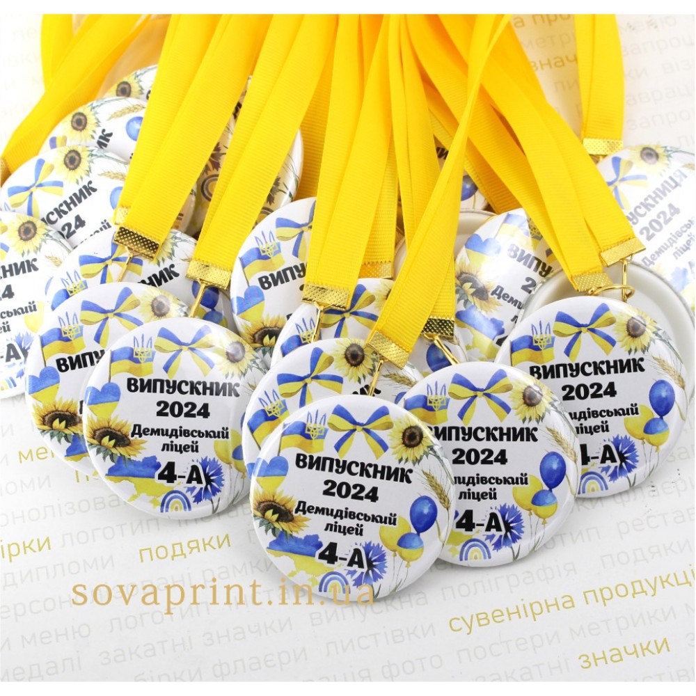 Предлагаем яркий значок в украинском стиле. Пусть каждый значок станет символом ваших эмоций и ощущений, связанных с Украиной. Такой сувенир надолго сохранит Вам и Вашим деткам приятные воспоминания. На именных значках по желанию можно добавить название ДНЗ и группы. В именном варианте всю информацию на закатном значке/медале можно редактировать. Девочек и мальчиков можно разделить цветом (например красный и синий), а также словом ВЫПУСКНИК / ВЫПУСКНИЦА (в комментариях к заказу оставляете информацию каких сколько). Также, значок можно украсить дополнительно розеткой из лент. Значок может легко трансформироваться в медаль если добавить ленту. Цвет можно выбрать перейдя по ссылке. Изготовление  закатных значков/медалей занимает 3-5 рабочих дня (сроки зависят от тиража и загруженности). Стоимость в товаре указана при заказе от 10шт.
