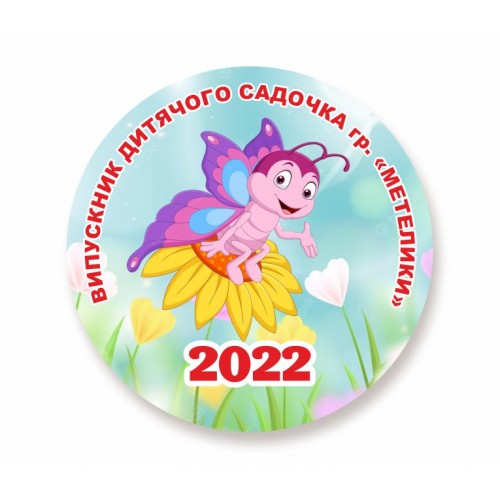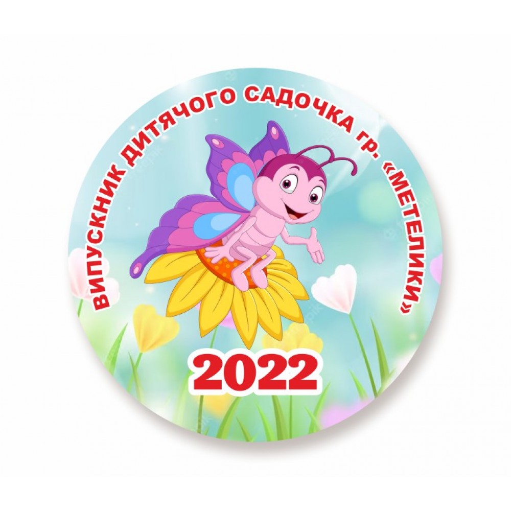 Готовый дизайн значка для выпукников детского сада с названием группы "Бабочки". По желанию можно добавить название ДУЗ. Всю информацию на именном закатном значке/медале можно редактировать. Девочек и мальчиков можно разделить цветом (например красный и синий), а также словом ВЫПУСКНИК / ВЫПУСКНИЦА. Также значок можно украсить дополнительно розеткой из ленты. Значок может легко превратиться в медаль, если добавить ленту. Цвет можно выбрать перейдя по ссылке. Изготовление  закатных значков/медалей занимает 3-5 рабочих дня (сроки зависят от тиража и загруженности). Стоимость в товаре указана при заказе от 10шт.