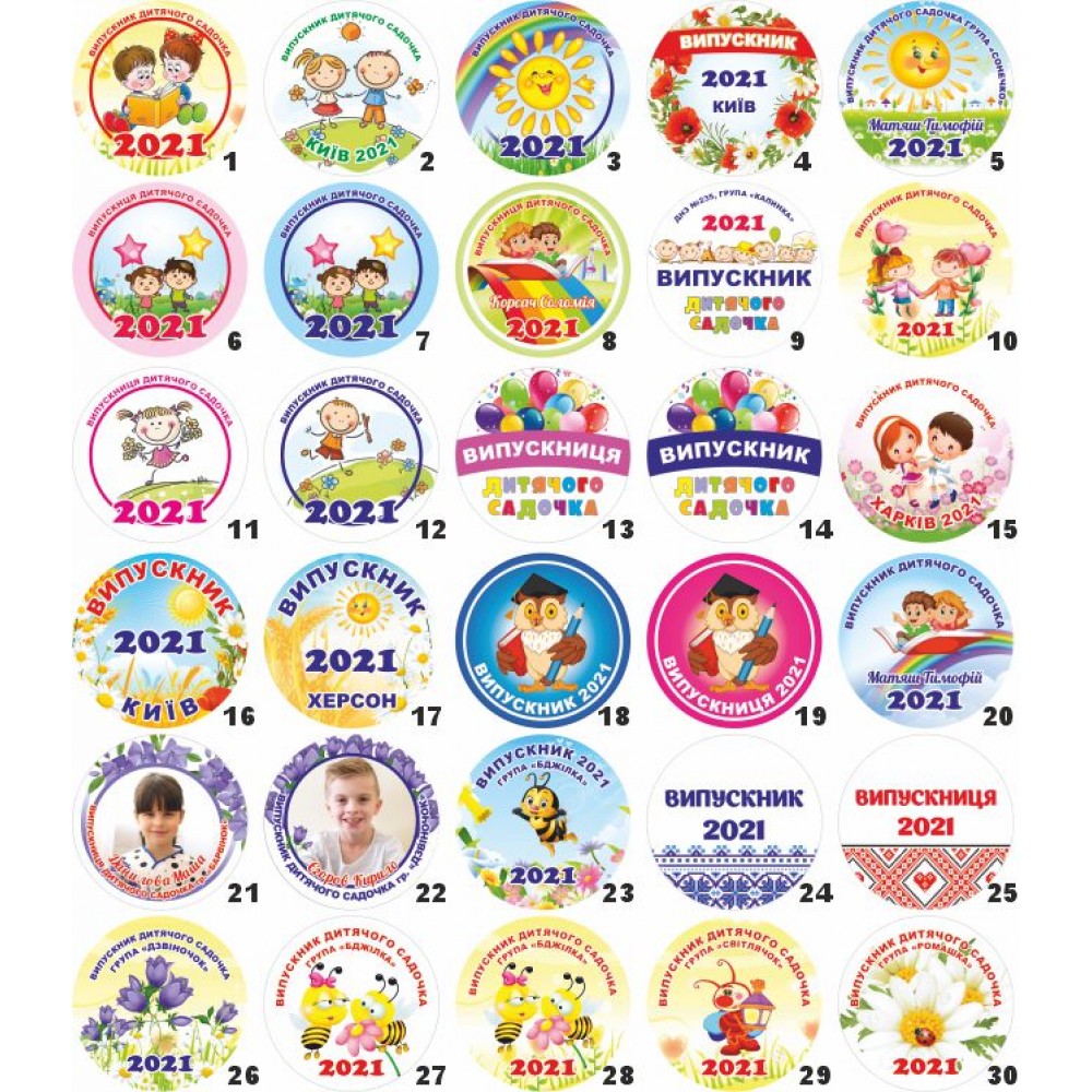 Предлагаем значки/медали для выпускного в саду и школе. У нас большой ассортимент дизайна закатных значков/медалей для Ваших выпускников. Такой сувенир на долго сохранит Вам и Вашему ребенку приятные воспоминания. Вы можете заказать стандартный дизайн или по желанию добавить название ДНЗ и группы, а также вместо картинки вставить фото ребенка (+15 грн. к стоимости), по необходимости производится небольшая корректировка фото по яркости-контрасту-резкости. (Важно!!! Требования к фото по ссылке). Вся информация в закатном значке/медали редактируемая! Девочек и мальчиков можно разделить цветом (например красный и синий (в комментариях к заказу оставляете информацию каких сколько)), а также словом ВЫПУСКНИК / ВЫПУСКНИЦА. Также, значок можно дополнительно украсить розеткой из лент. Значок может легко трансформироваться в медаль если добавить ленту. Цвет можно выбрать перейдя по ссылке. Изготовление закатных значков/медалей занимает 3-5 рабочих дня (сроки зависят от тиража и загруженности). Стоимость в товаре указана при заказе от 10шт.
