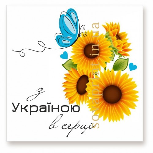 Листівки патріотичні з написом "З Україною в серці". Надруковані на щільному крейдованому папері. На листівку можна додати будь-який Ваш текст: телефон, адресу, сайт, логотип тощо (послуга платна). Це зображення можна використати на бірках або наліпках.