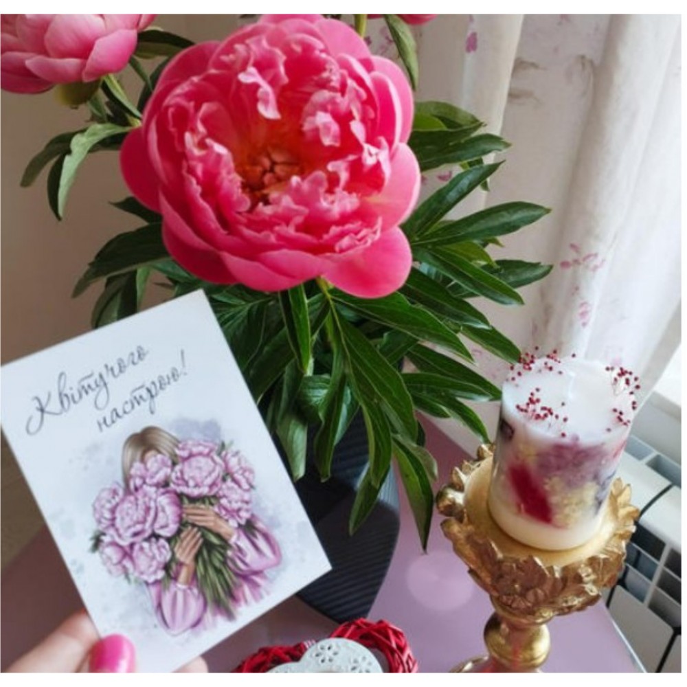 Побажання квітучого настрою для дівчат/жінок будь-якого віку у вигляді листівки. Підійде для будь-якого свята: 8 березня, Дня Матері або ж до Дня народження, тощо. Також така листівка може бути прекрасним компліментом в товар для клієнтів від продавця або виробника. Надруковані на щільному крейдованому папері. На листівку можна додати будь-який Ваш текст (послуга платна). Це зображення можна використати на бірках або наліпках.