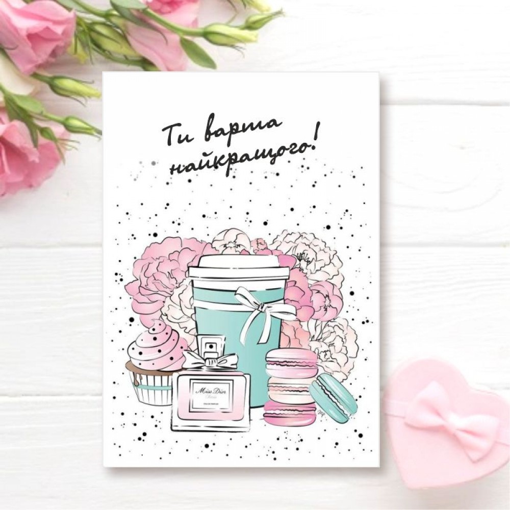 Універсальна листівка для будь-якої нагоди з написом "Ти варта найкращого" підійде для свята 8 березня, Дня Матері або ж до Дня народження. Також така листівка може бути прекрасним компліментом в товарі для клієнтів від продавця або виробника. Надруковані на щільному крейдованому папері. На листівку можна додати будь-який Ваш текст (послуга платна). Це зображення можна використати на бірках або наліпках.