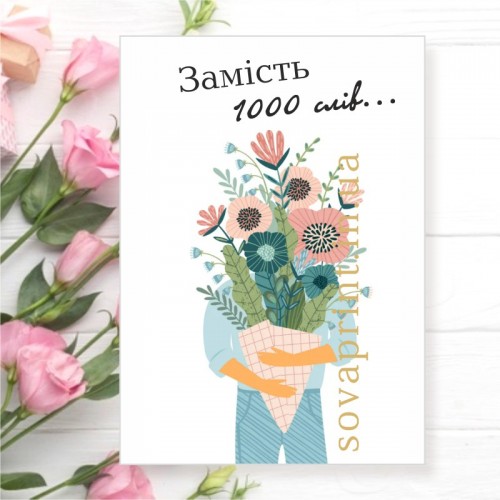 Листівка з написом "Замість 1000 слів" підійде для будь-якої нагоди 8 березня, Дня Матері, Дня вчителя або ж до Дня народження чи до Дня закоханих. Також така листівка може бути прекрасним компліментом в замовленні для клієнтів від продавця. Надруковані на щільному крейдованому папері. На листівку можна додати будь-який Ваш текст (послуга платна). Це зображення можна використати на бірках або наліпках.