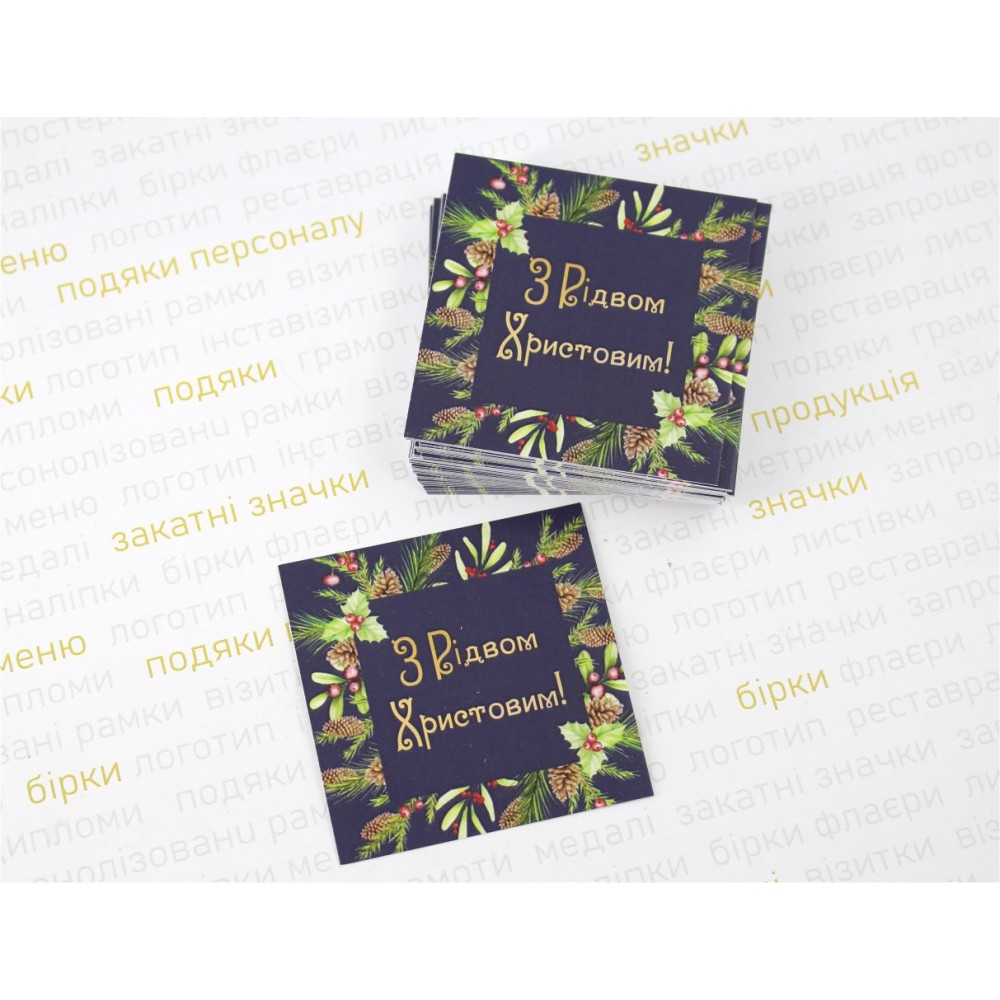 На свято Різдва пропонуємо листівки 65х65мм. Компактний розмір листівки, підійде для маленьких пакуночків клієнтських замовлень. Наша галерея листівок постійно поповнюється новими листівками різної тематики. Друкуються на щільному крейдованому матовому папері. Листівка може бути іншого розміру за запитом. Напис може бути на будь-якій мові (індивідуальне замовлення). На листівку можна додати будь-який Ваш текст: телефон, адресу, сайт, логотип тощо (послуга платна). Це зображення можна використати на бірках або наліпках.