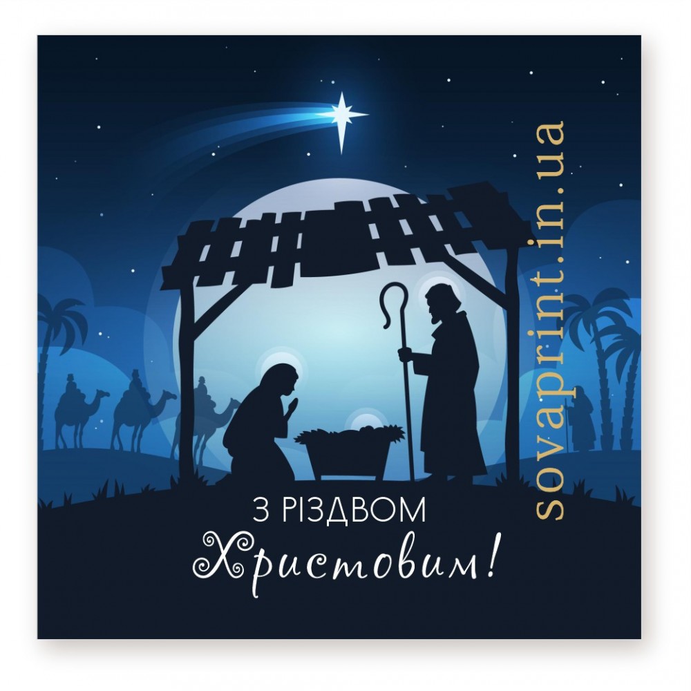 Листівка Різдвяна 7х7см. Компактного розміру. Покладіть таку листівку в товар покупцеві, повірте, йому буде приємно! Наша галерея постійно поповнюється новими листівками різної тематики. Друкуються на щільному крейдованому матовому папері. Листівка може бути іншого розміру, з ламінацією, іншої щільності за запитом. Напис може бути на будь-якій мові (індивідуальне замовлення від 100шт). На листівку можна додати будь-який Ваш текст: телефон, адресу, сайт, логотип тощо (послуга платна). Це зображення можна використати на бірках або наліпках.