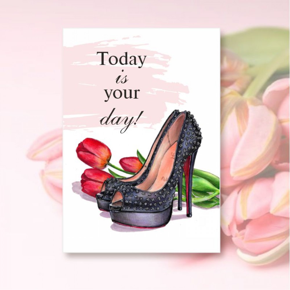 Листівка 7х10 см з написом "Today is your day".  Підійде для свята 8 березня, Дня Матері або ж до Дня народження чи для будь-якої іншої події. Надруковані на щільному крейдованому папері. На листівку можна додати будь-який Ваш текст (платна послуга). Це зображення можна використати на бірках або наліпках.