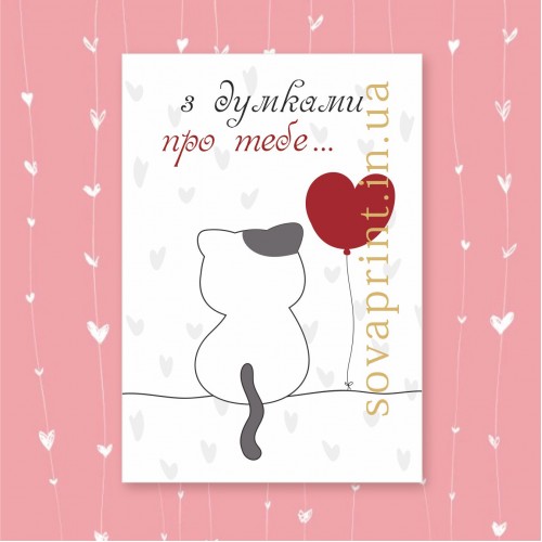 Листівка з написом "З думками про тебе". Друкується на щільному крейдованому папері. Листівка може бути іншого розміру за запитом. Напис може бути на будь-якій мові (індивідуальне замовлення). На листівку можна додати будь-який Ваш текст: телефон, адресу, сайт, логотип тощо (послуга платна, індивідуальне замовлення від 100шт). Це зображення можна використати на бірках або наліпках.