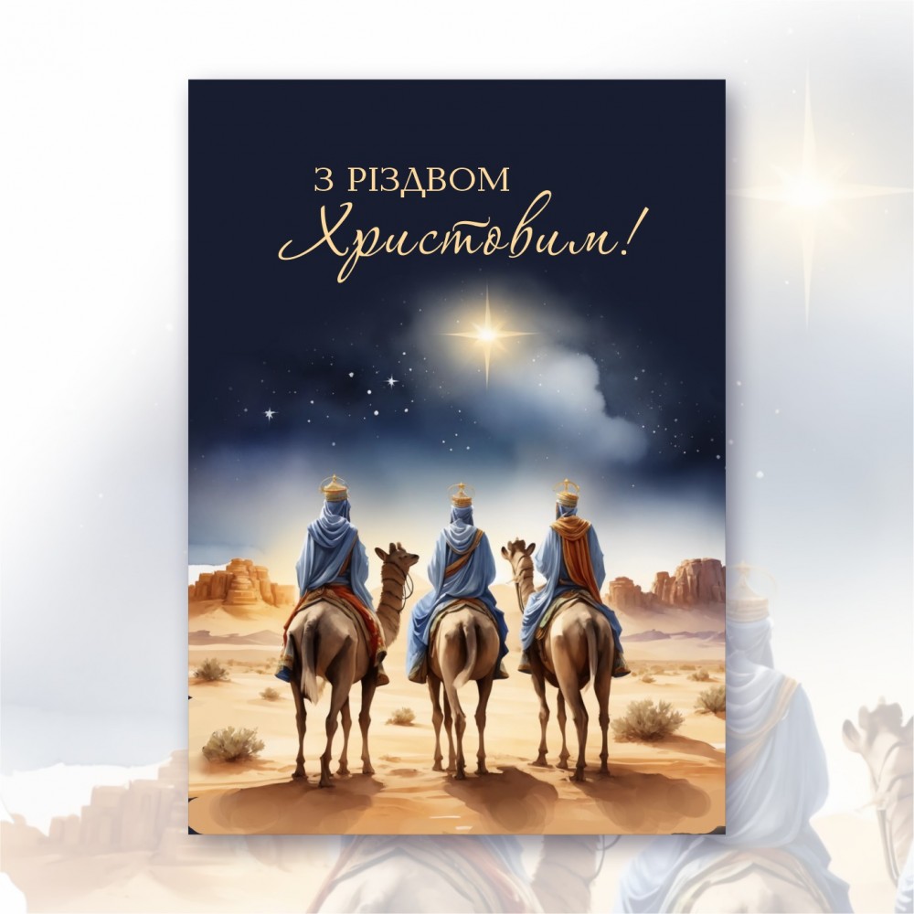 До свята Різдва Христового пропонуємо тиматичну листівку. На листівці зображені волхви, що слідують за зіркою. Яскрава листівка нагадає про саму суть свята.Наш інтернет магазин постійно поповнюється новими листівками різної тематики. Підійде для вкладання в товар. Друкуються на щільному крейдованому матовому папері 300-350г/м2. На листівку можна додати будь-який Ваш текст: телефон, адресу, сайт, логотип тощо (послуга платна). Це зображення можна використати на бірках або наліпках.