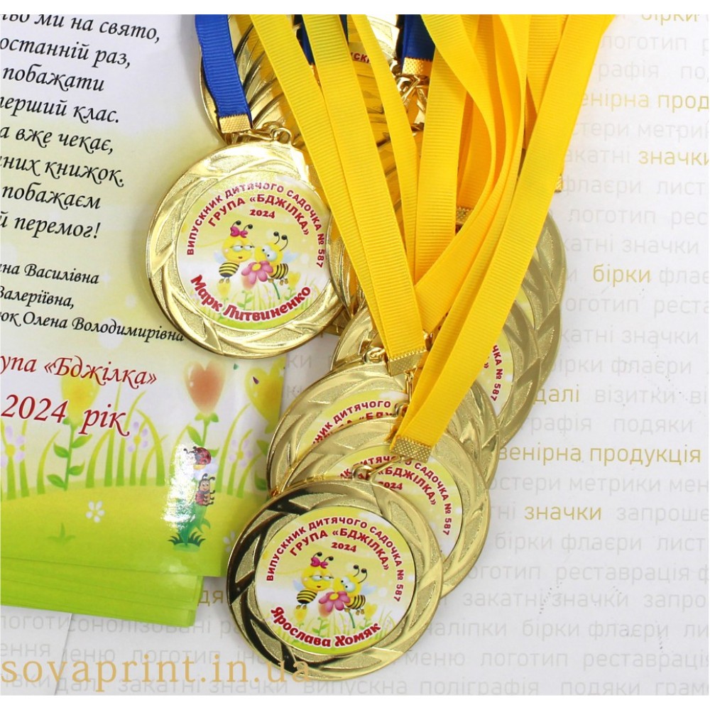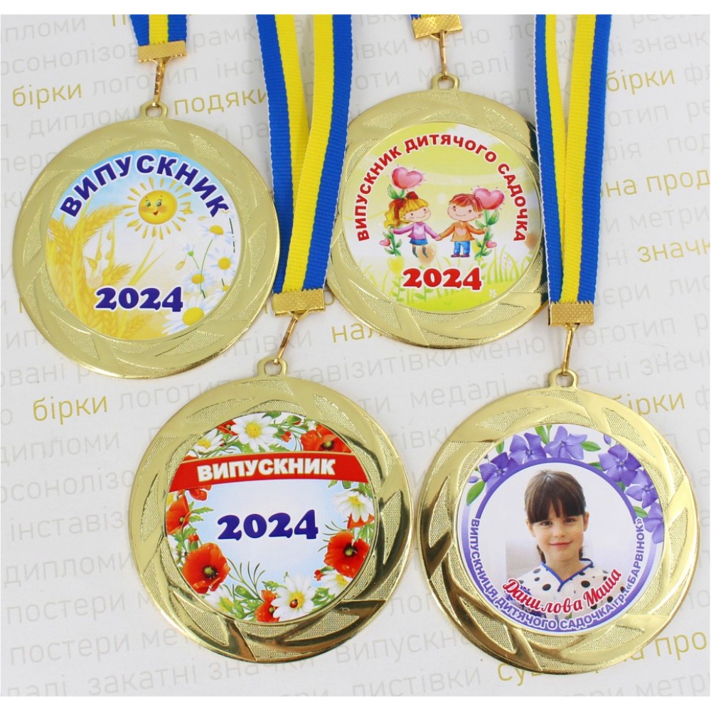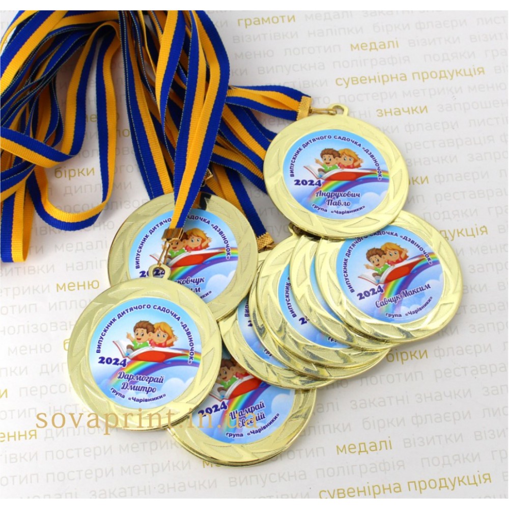 Металеві медалі 70мм в діаметрі, інформативна частина 51мм, колір - золото. Вклейка (житон) виконана з плівки самоклейки. Є можливість обрати один з готових дизайнів. Медаль комплектується стрічкою, колір якої можете обрати за посиланням. Медалі з фото (+20грн за кожну медаль. Проводимо мінімальну корекцію фото). Виготовлення займає від 3-х робочих днів (терміни залежать від тиражу та завантаженності).