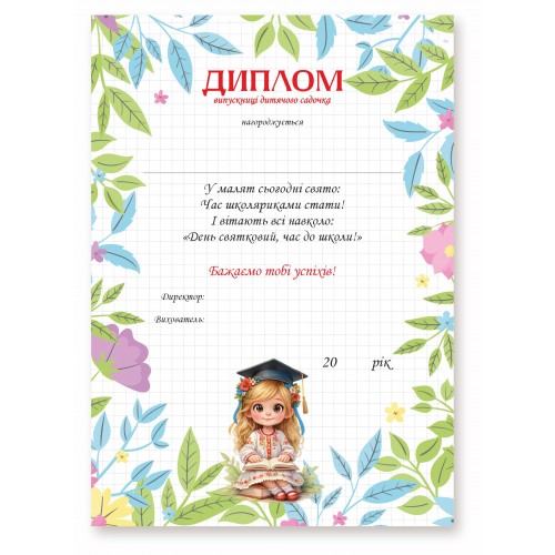 Ніжні та стильні дипломи для маленьких випускників — чудовий спосіб зберегти теплі спогади про дитинство. Окремі дизайни для хлопчика та дівчинки роблять кожен диплом особливим і більш персоналізованим. Легкий квітковий фон, милий дитячий ілюстративний стиль та продуманий текст створюють святковий настрій і підкреслюють важливість цього дня. Диплом доступний розміром А4 та А5. Надрукований на щільному папері 350г/м2. Для замовлення доступний вже готовий бланк диплому, який Ви зможете заповнити самостійно або по бажанню замовити іменний диплом в якому можна вставити назву ДНЗ і групи, прізвища та імена дітей, ПІБ директора, вихователів,тощо. Або прислати нам свій віршик. Вся друкована частина диплому змінна (тільки в іменних). Диплом на довго збереже Вам та Вашим діткам приємні спогади про випускний. Виготовлення диплому займає 3-5 робочих днів (терміни залежать від тиражу та завантаженості (квітень/травень завантаженість 101%).