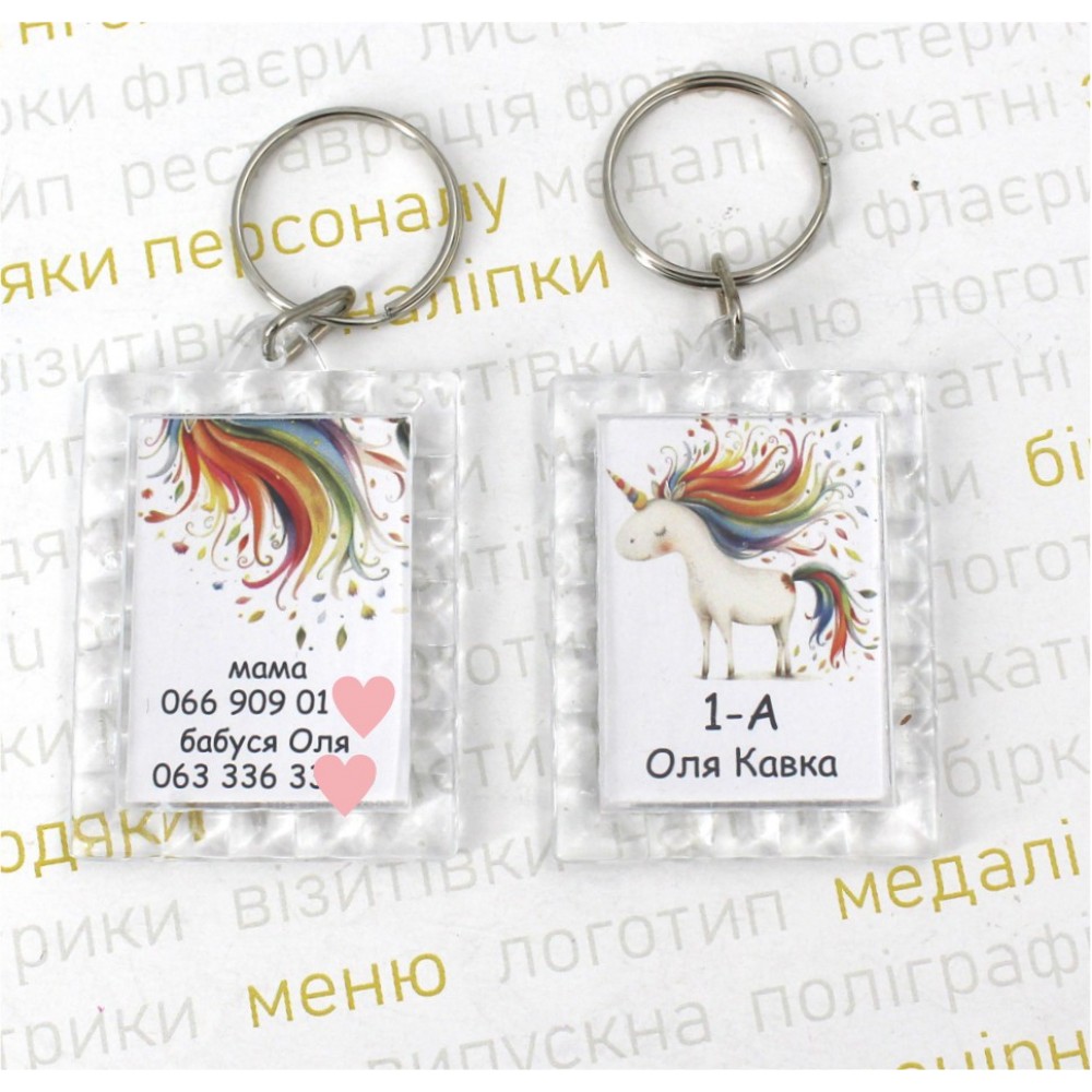 Якщо дитина ще не знає номери телефонів своїх батьків, маємо прекрасне рішення такого питання. Двосторонній акриловий брелок з необхідною інформацією. У випадку потреби, можна швидко скористатись брелком на якому можуть бути контакти обох батьків. Або якщо дитина і знає номери телефонів батьків, в стресовій ситуації може не всі циіри згадати, тоді на виручку приходить знову ж таки дуже зручний брелок. Інформація розташована з обох сторін брелка. Брелок може містити бeдь-яку інформацію: ім'я/прізвище, клас, номер школи, контактні дані батьків або особисті. Може бути прикріплений до рюкзака, пеналу або ключів для щоденного використання. Якщо такий брелок прикріпити до ключів, у випадку їх втрати, доброзичлива людина зможе легко зв'язатися з вказаним номером телефону та повернути ключі. Брелок "Картка учня" – це не лише стильний аксесуар, але й практичний інструмент задля безпеки вашої дитини. Замовте зараз і переконайтеся у його зручності та користі!