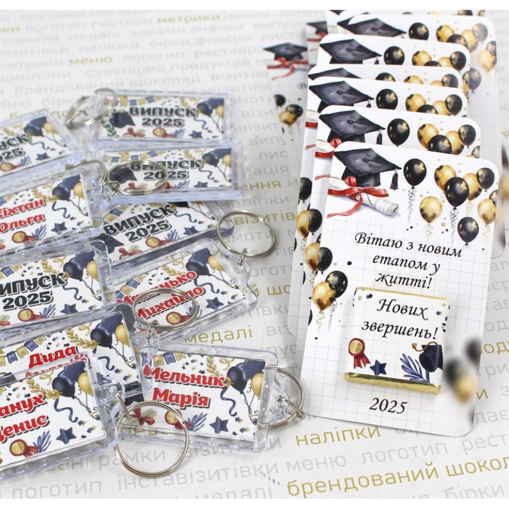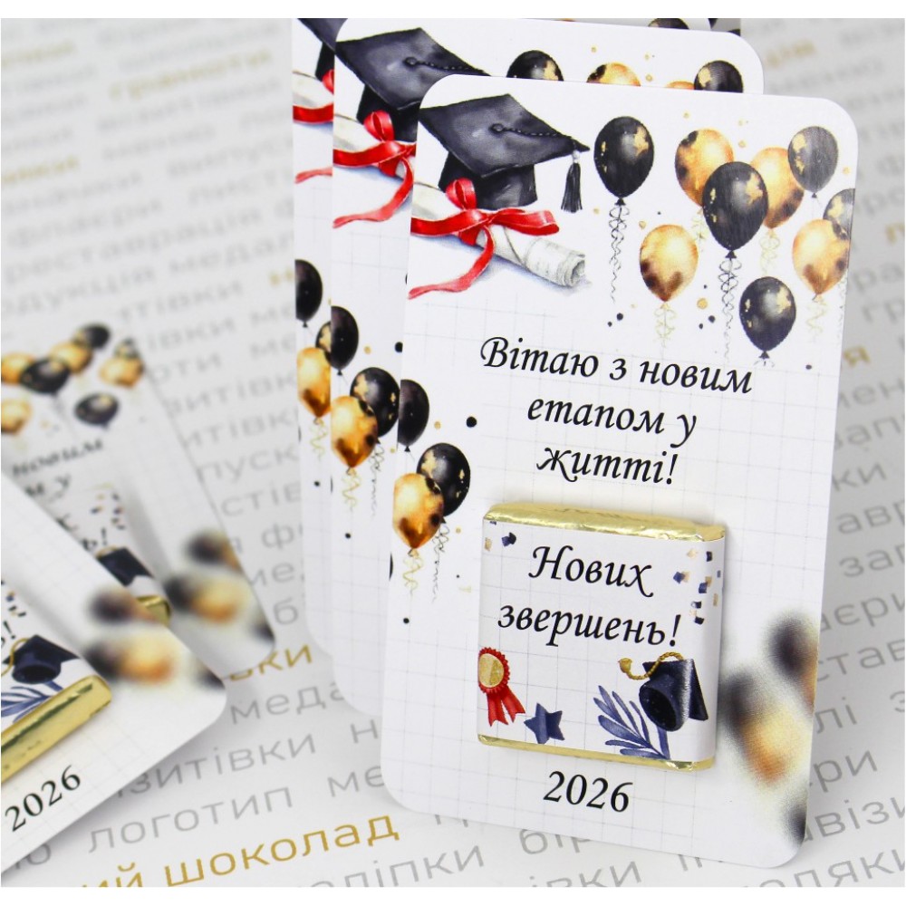 Оригінально, стильно, солодко, незабутнє. Шоколад з'їсться - листівка, як спогад залишиться. Даруйте оригінальні подарунки. Листівка 60х100мм, шоклад порційний. Дизайн може бути іменний (за бажанням можна додати назву закладу, клас, ім'я дитини). Вага шоколаду 5,5г, розмір 32х32х 4,5мм. Може бути чорний або молочний. Фольга золото або срібло. Термін зберігання 10-12 міс. Зберігання при температурі 18-25 С˚ та відносній вологості повітря 70-80%. Вартість в товарі вказана при замовленні від 20шт.