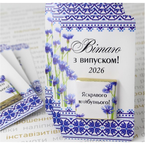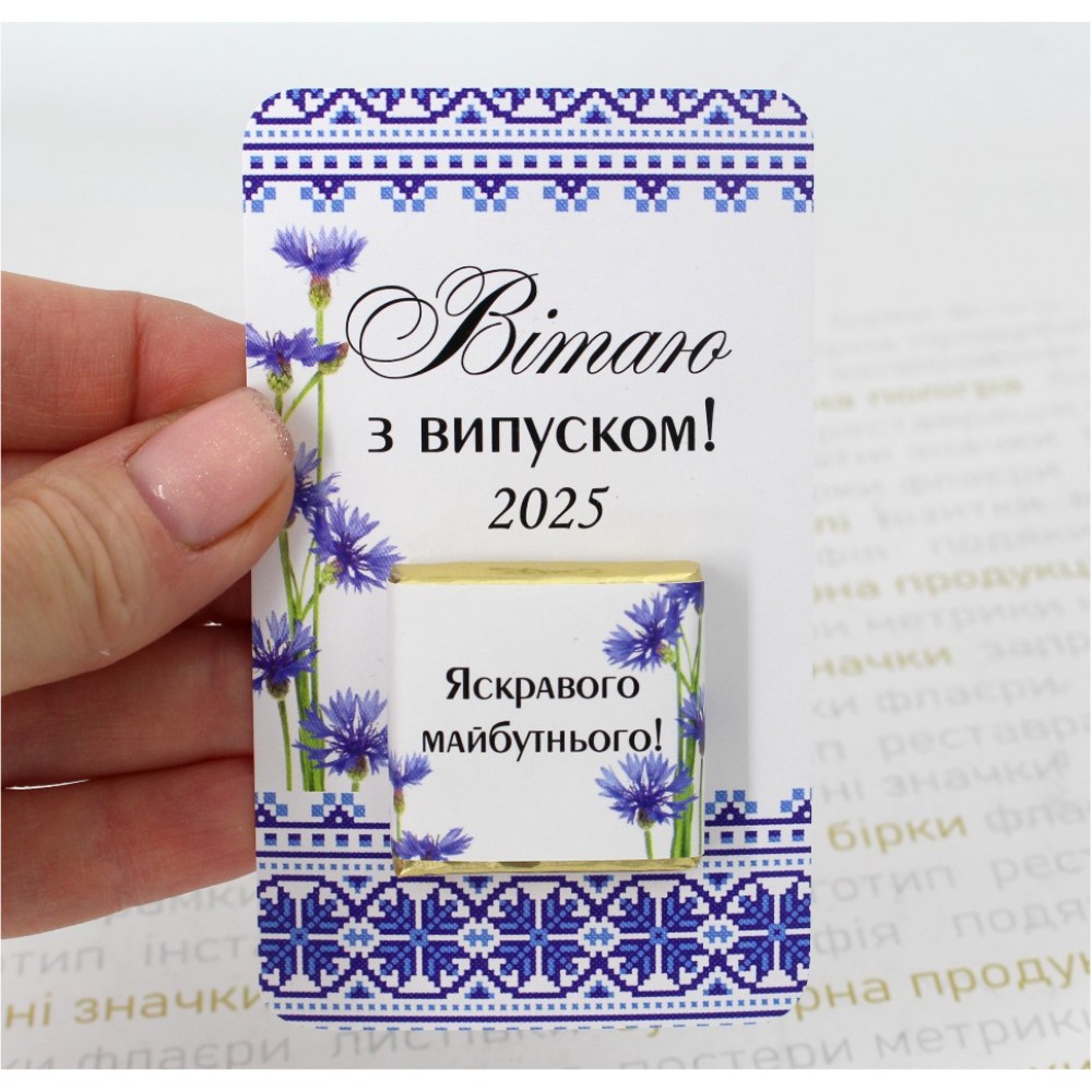 Ідеальний та оригінальний спосіб підсолодити святковий день! Молочний або темний шоколад на планшетці з тематичним дизайном. Це не тільки солодке частування, а й символ теплих спогадів про шкільні роки, шоколадка з'їсться, планшетка залишиться, як спогад. Ідеально підходить для вручення учням, вчителям або однокласникам у цей особливий день! Стандартний варіант дизайну: Напис на планшетці "Вітаю з випуском" та поточний рік. Дизайн може бути іменний (будь-який Ваш напис) Вага шоколаду 5,5г, розмір 32х32х5мм. Може бути чорний або молочний. Фольга золото або срібло. Термін зберігання 10-12 міс. Зберігання при температурі 18-25 С˚ та відносній вологості повітря 70-80%. Вартість в товарі вказана при замовленні від 20шт.