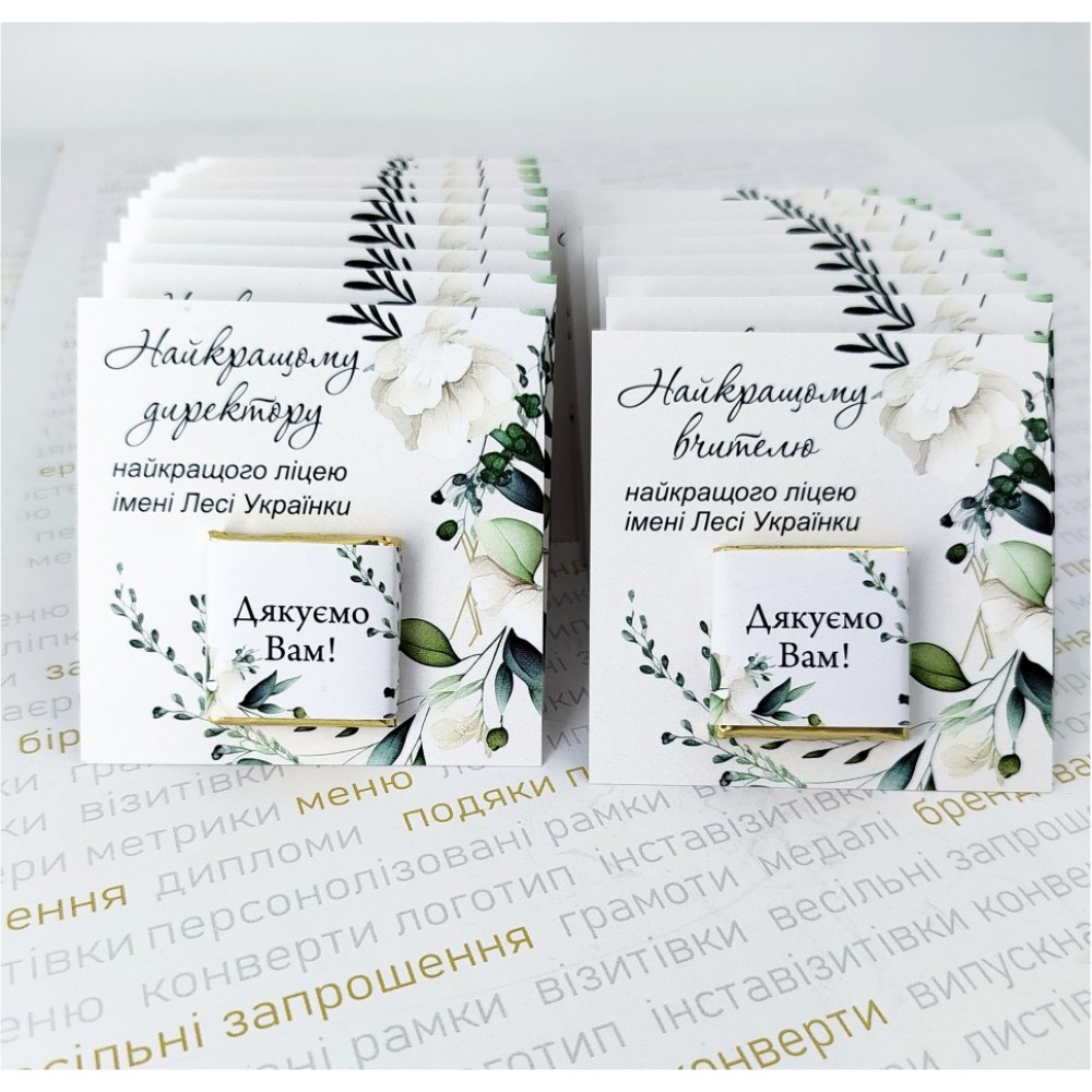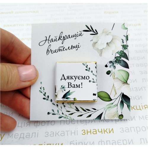 Солодко, красиво, оригінально і приємно! Листівка + шоколад, прекрасне поєднання.  Додавання інформації у вже готовий дизайн на обгортку шоколадки - безкоштовна (без зміни дизайну і при умові замовлення не менше 20шт). Внесення змін на планшетці (окрім дизайну) платно. Розмір планшетки (листівки) 80х80мм, щільність картону 350г/м2. Може бути двосторонній друк. Також за бажанням листівка може бути інфшого розміру та форми. Вага шоколаду 5,5г, розмір 32х32х 4,5мм. Може бути чорний або молочний. Фольга золото або срібло. Термін зберігання 10-12 міс. Зберігання при  температурі 18-22 С˚ та відносній вологості повітря 70-80%.  Вартість в товарі вказана при замовленні від 20шт.