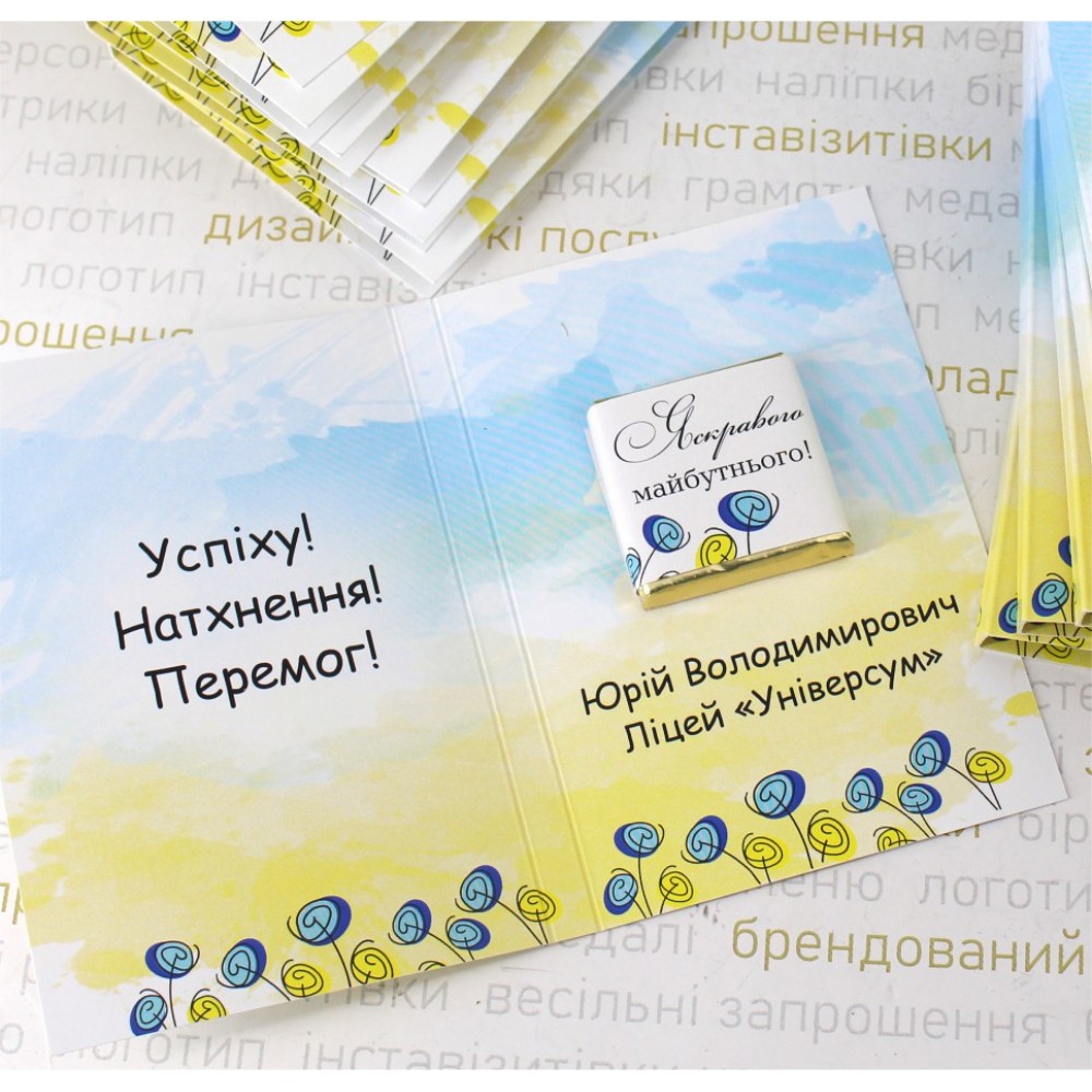 Мінікнижечка з шоколадкою на випуск — невеликий, але приємний подарунок зі змістом. Лаконічний напис на обкладинці та солодкий сюрприз усередині. Оригінальна подача привітання з випуском. Шоколадка з'їсться, листівка залишиться на довгий спогад про школу чи садок. Може бути стандарт, іменний (на всіх однакова інформація) або іменний+ПІБ (з іменами дітей, або будь-яка змінна, текстова інформація). Для іменної продукції: імена, прізвища (вся текстова інформація) мають бути набрані текстом, щоб можна було скопіювати (це може бути будь-який текстовий документ) або список у меседжері. Розмір в розгорнутому вигляді 100х145мм, в згорнутому 100х70мм. Кожна листівка запакована в пакетик з липкою стрічкою.