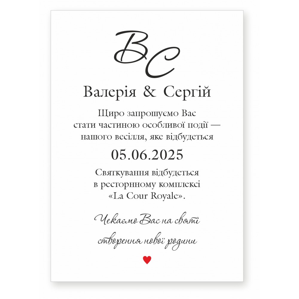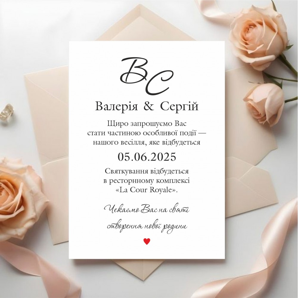 Лаконічне та стильнеіменне запрошення, друк односторонній. Ідеальне рішення для тих, хто цінує естетику, простоту та персональний підхід. Може бути вклеєне в конверт, який комплектується стрічкою або сургучем або може бути класичний конверт, або ж по бажанню це може бути калька. Ваше кохання — це історія, яку хочеться розповісти красиво. Данне запрошення надруковане на крейдованому папері (350г/м2) або дизайнерському картоні Tintoretto gesso (легка акварельна фактура) або Dali candido (легка фактура вельвет вертикальна або горизонтальна смужка). Імена, дата, ресторан, час — все адаптується під Вашу подію. Розмір запрошення 140х105мм або 148х105мм. Запрошуйте гостей на весілля красиво!