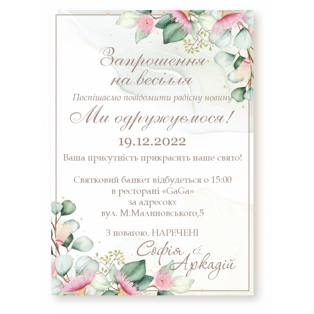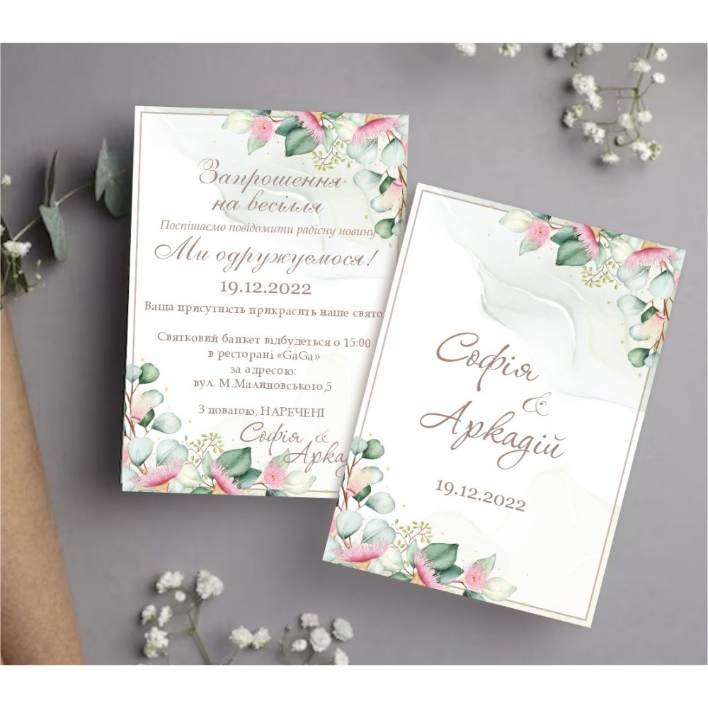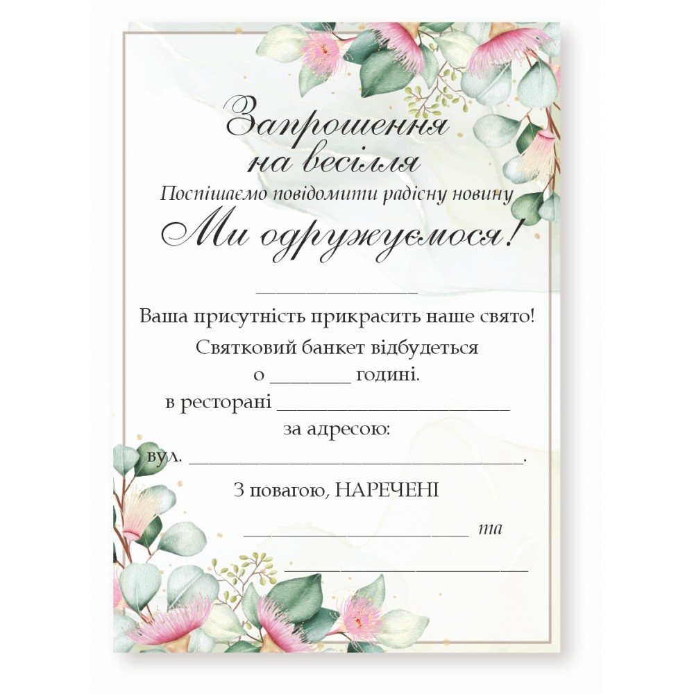 У нашому інтернет магазині можна замовити весільні запрошення, бірки, конверти або кальку до запрошень. Маємо великий вибір дизайну запрошень, обравши один із них можете замовити іменне або стандарт. В іменному запрошенні вся інформація змінна (двостороннє запрошення). Бланк запрошення (одностороннє) призначене для самостійного заповнення від руки. Запрошення А6 формату (105х148мм). Друкується на щільному папері 300г/м2. Додатково можете замовити конверт або кальку для запрошень. Також доступний цифровий варіант запрошення, яке Ви можете розіслати необмеженій кількості гостей зручним для Вас способом - по e-mail, вайбер, телеграм тощо.