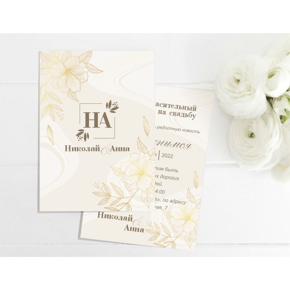 Запрошення на весілля А6 формату (105х148мм), надруковане на щільному папері 300г/м2. Можна замовити як іменне запрошення, де Ви можете додати ініціали наречених, час, адресу, назву ресторану, тощо (двостороннє запрошення), так і стандартний бланк для самостійного заповнення (одностороннє запрошення).  Додатково можете замовити конверт. Також доступний цифровий варіант запрошення, яке Ви можете розіслати необмеженій кількості гостей зручним для Вас способом - по e-mail, вайбер, телеграм тощо. Вартість цифрового запрошення 80 грн. Доповнити запрошення можна весільними бірками, які довго будуть нагадувати гостям про Ваше свято.